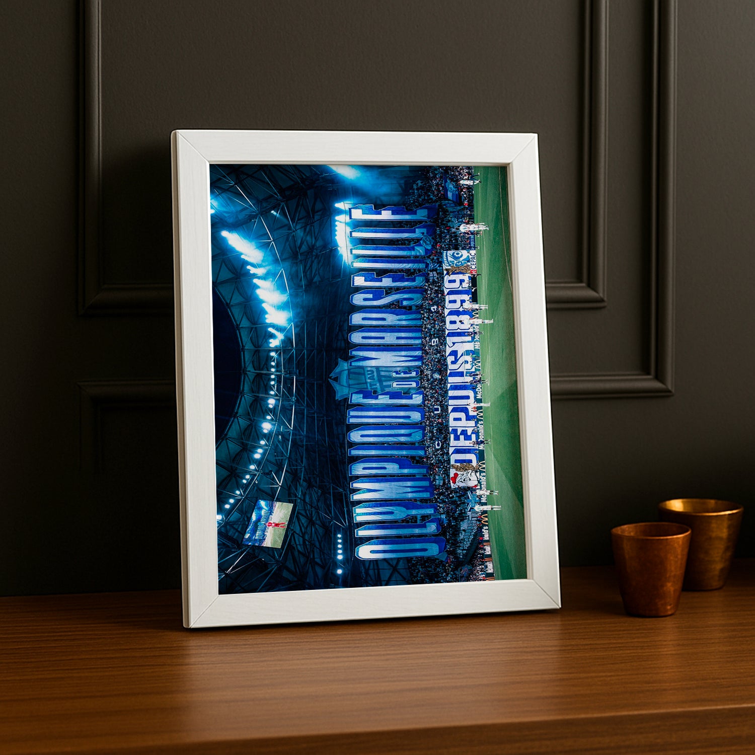 Immortalisez vos souvenirs olympiens avec ce cadre photo dédié à l'Olympique de Marseille ! Parfait pour les supporters passionnés, ce cadre met en avant le stade emblématique du club avec style et fierté. Que ce soit pour afficher une photo de match mémorable, un moment en famille au stade ou un portrait de votre joueur préféré, ce cadre transforme chaque instant en célébration de votre amour pour l'OM. Un incontournable pour décorer votre chambre, bureau ou salon aux couleurs blanc et bleu !