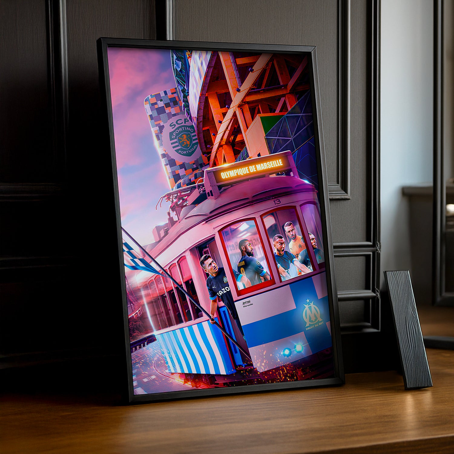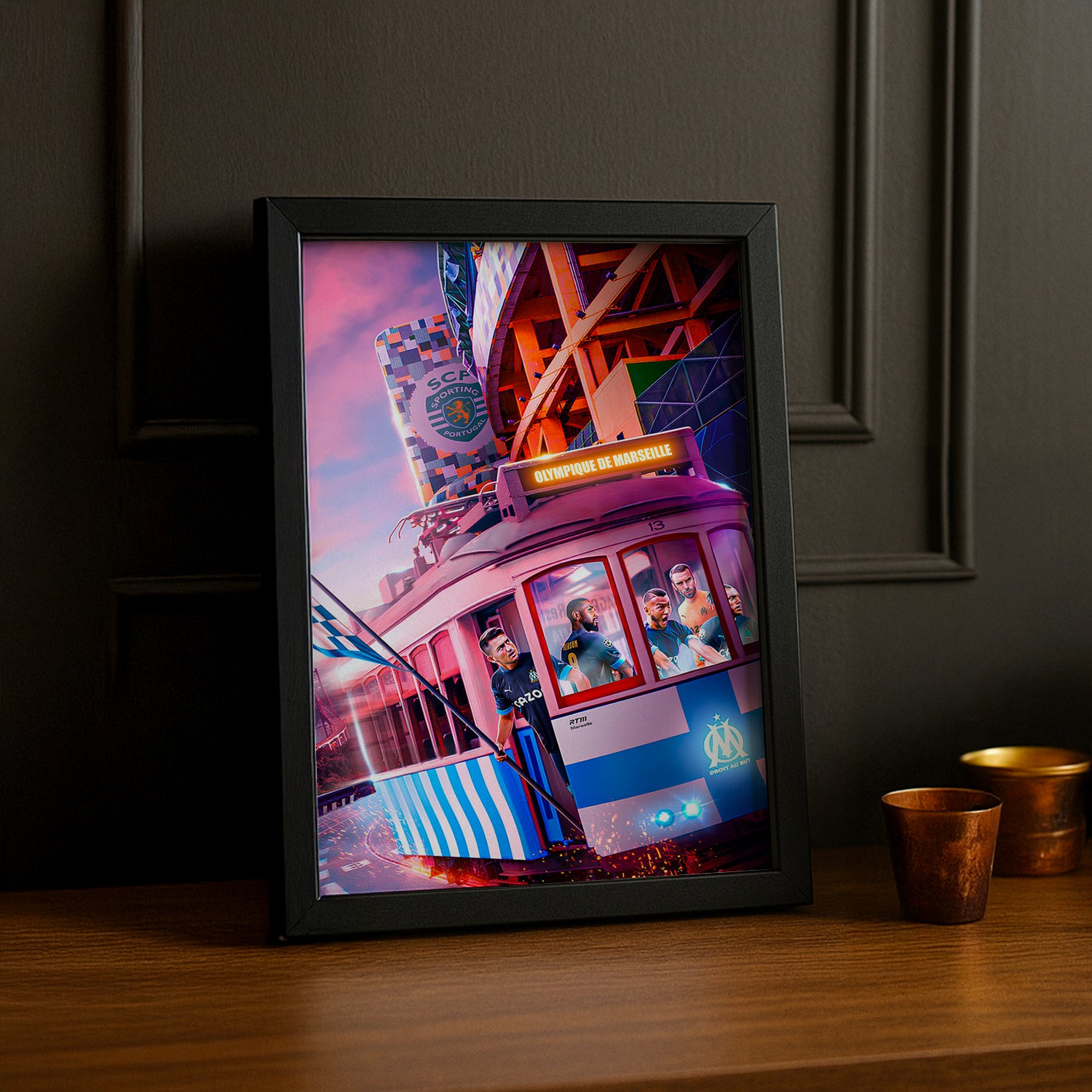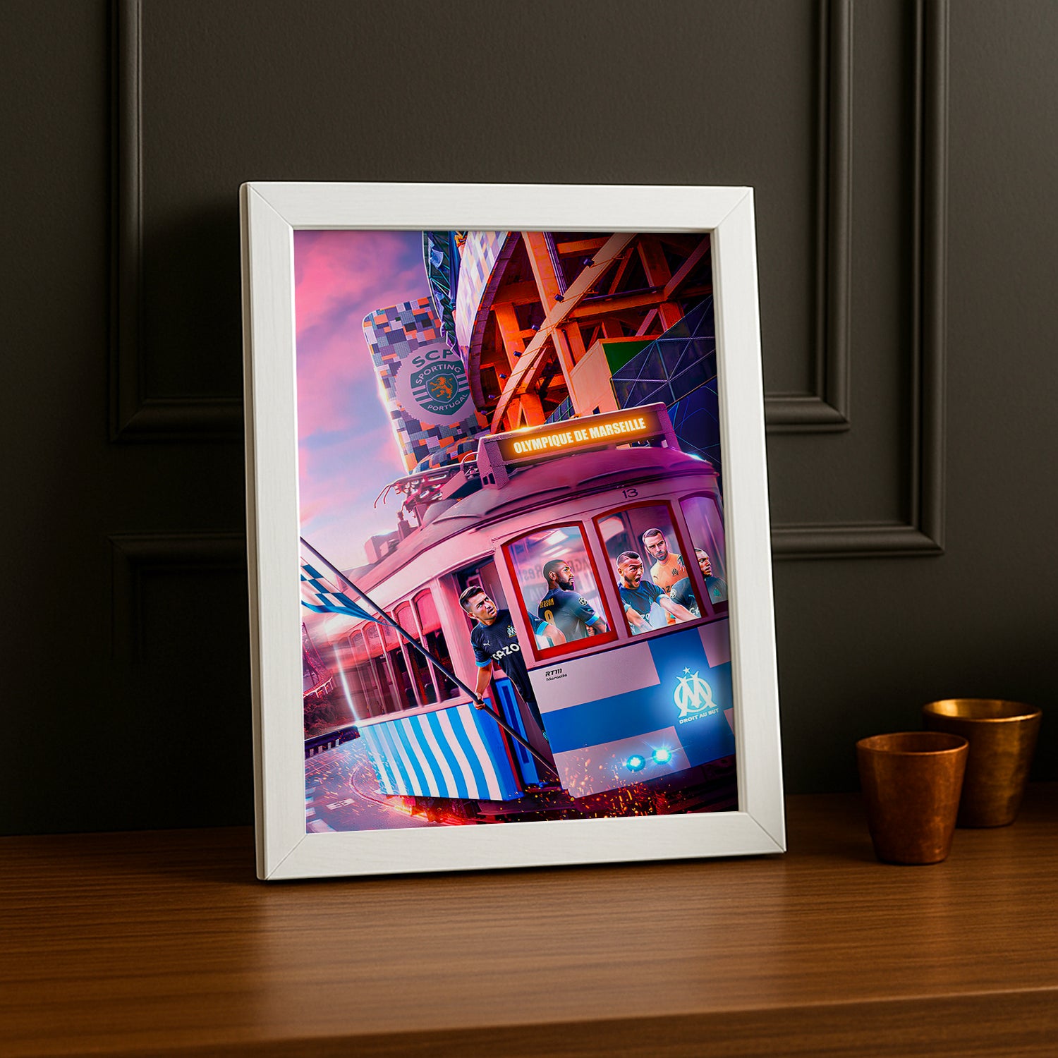 Cadre photo avec une illustration de train aux couleurs de l'Olympique de Marseille. Parfait pour les supporters à la recherche d'une décoration originale !