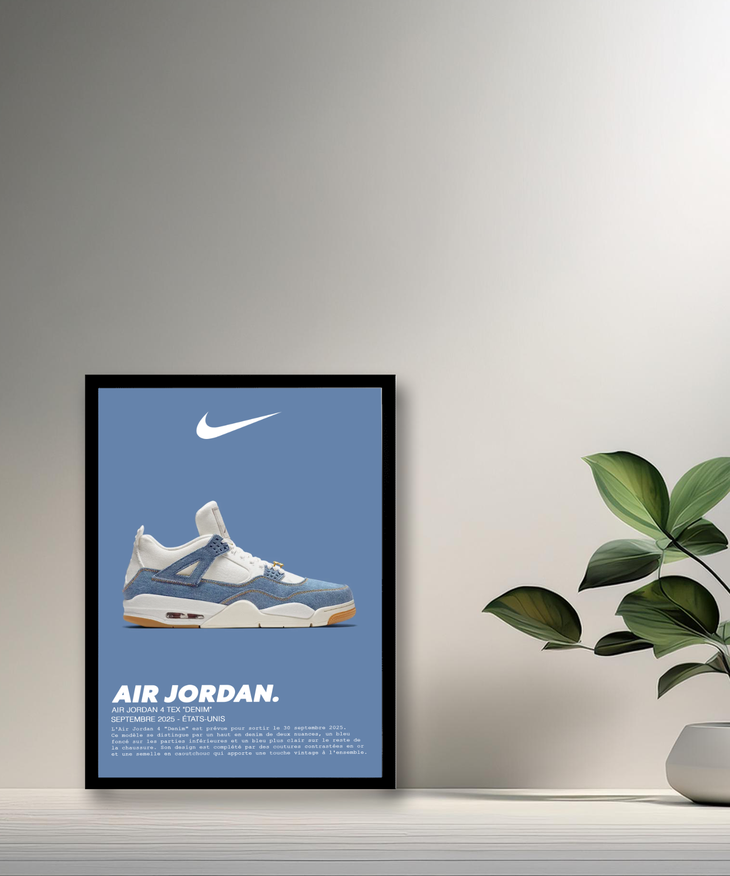 Verleihen Sie Ihrer Einrichtung einen Hauch von einzigartigem Stil mit diesem Fotorahmen, der dem Air Jordan 4 Retro „Tex Denim“ gewidmet ist. Dieses ikonische Modell zeichnet sich durch den mutigen Einsatz von Denim und hochwertigem Leder aus und vereint Komfort und entspannte Ästhetik. Denimblautöne und dezente Lederakzente sorgen für einen Look, der sowohl den Geist der Streetwear als auch das Erbe der Basketballkultur einfängt.