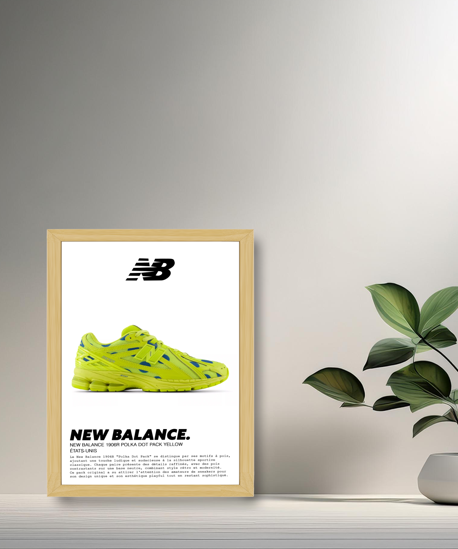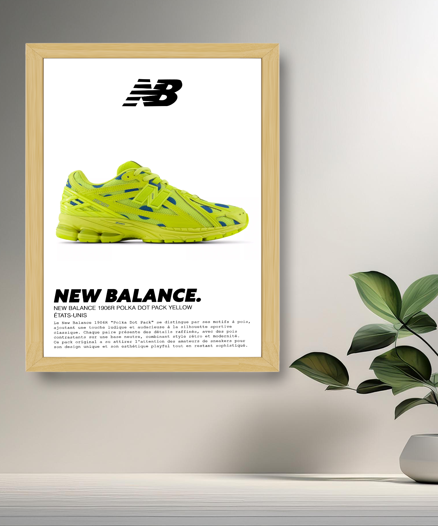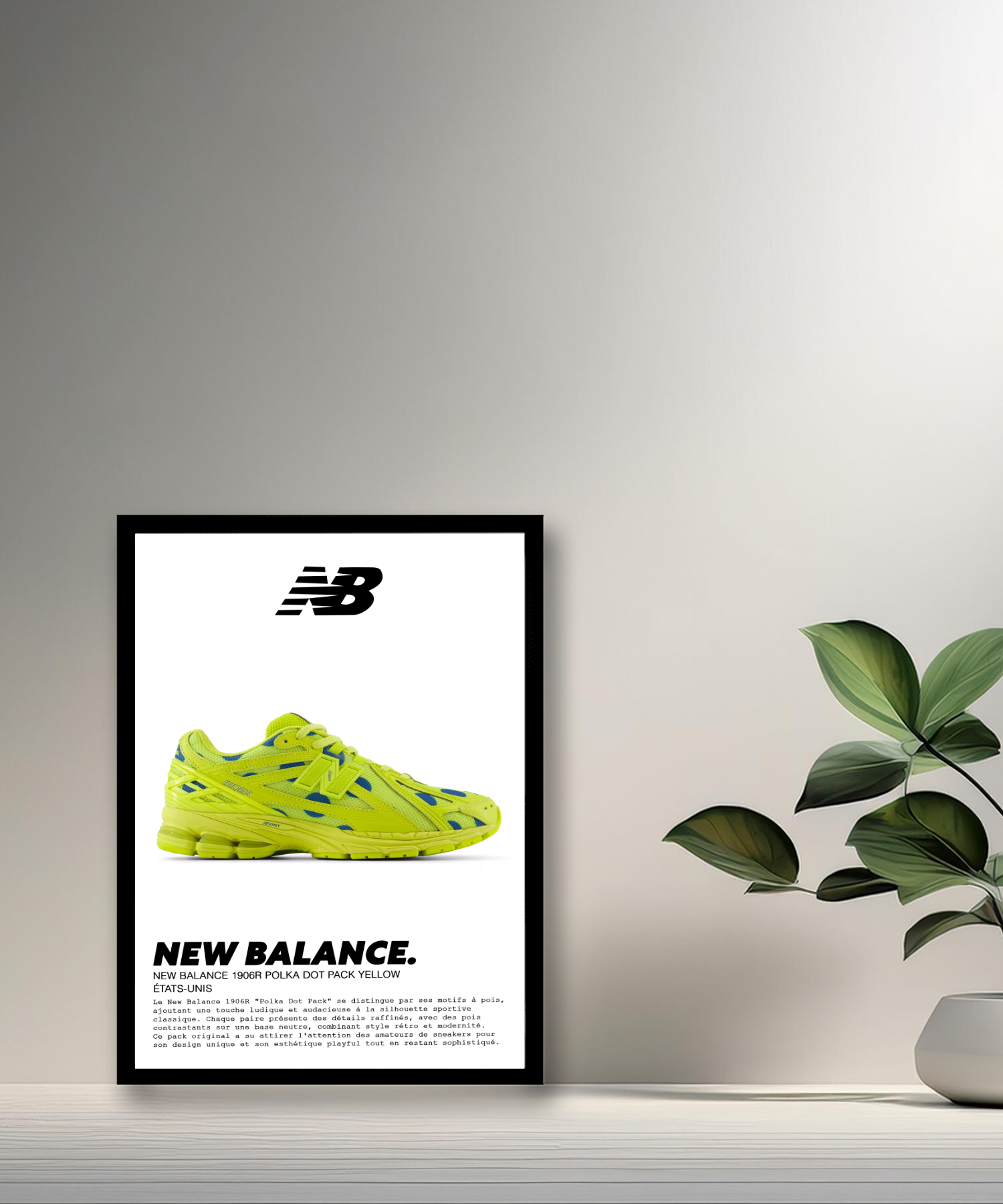 Verschönern Sie Ihre Dekoration mit diesem Fotorahmen, der dem New Balance 1906R „Polka Dot Pack Yellow“ gewidmet ist. Dieser auffällige Sneaker, Teil des „Polka Dot Pack“, zeichnet sich durch sein lebendiges und verspieltes Design aus, das leuchtendes Gelb mit kontrastierenden Polka-Dot-Mustern mischt. Mit seiner Mischung aus Modernität und Retro-Stil verkörpert der 1906R perfekt den gewagten Geist zeitgenössischer Streetwear.