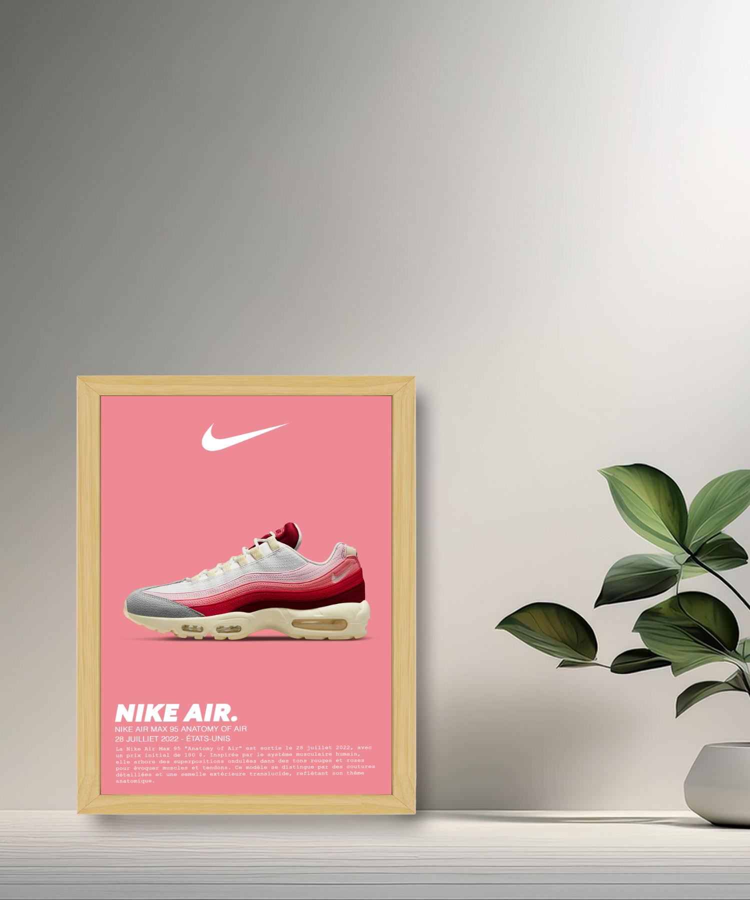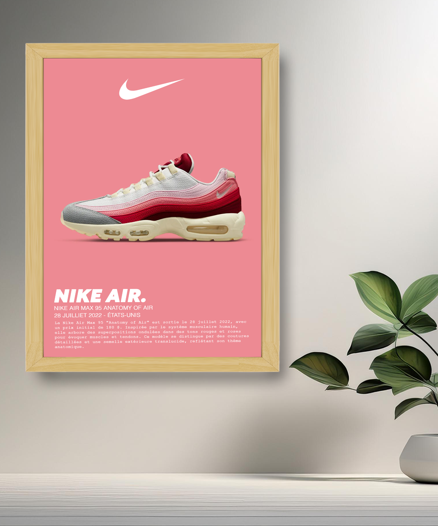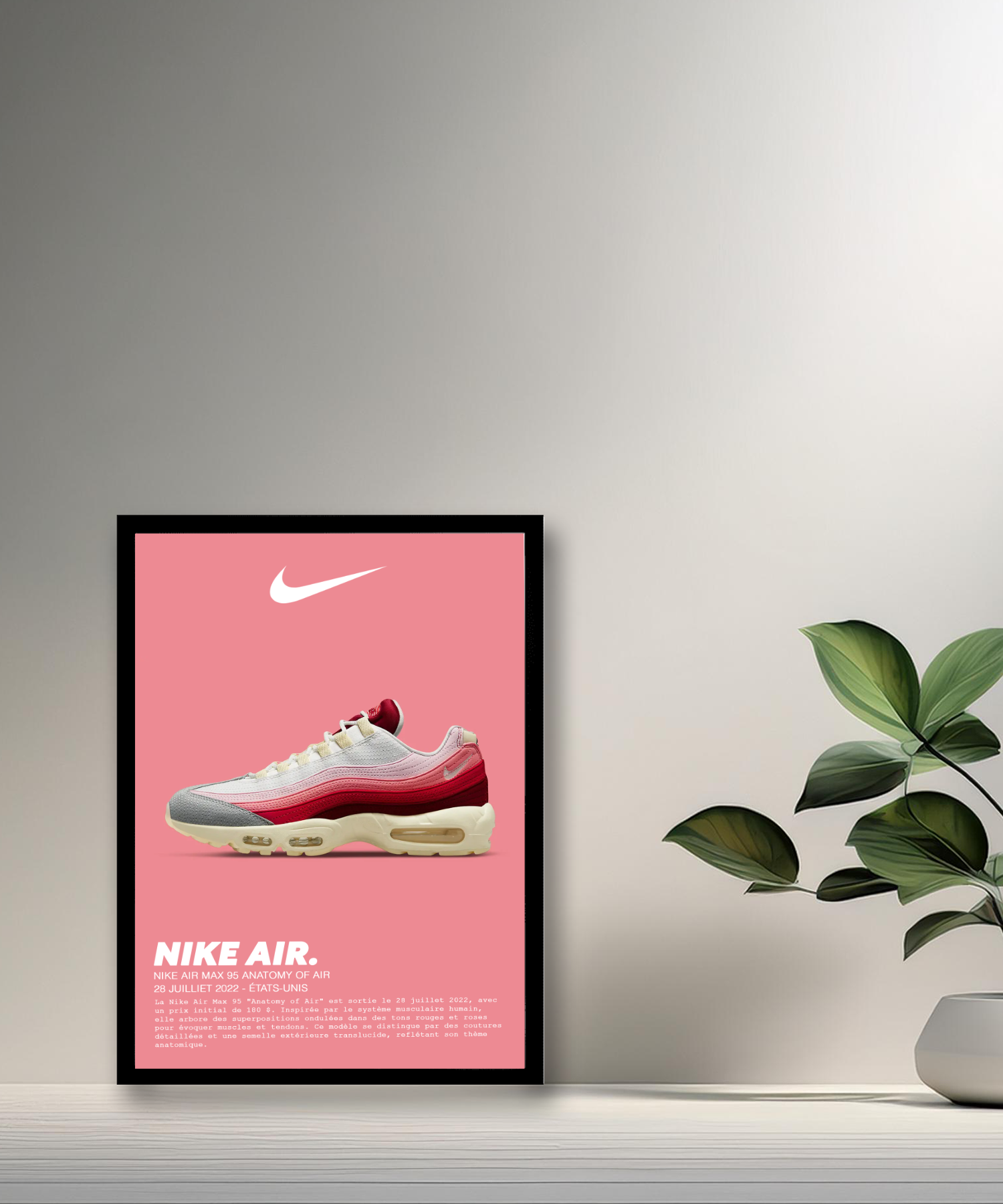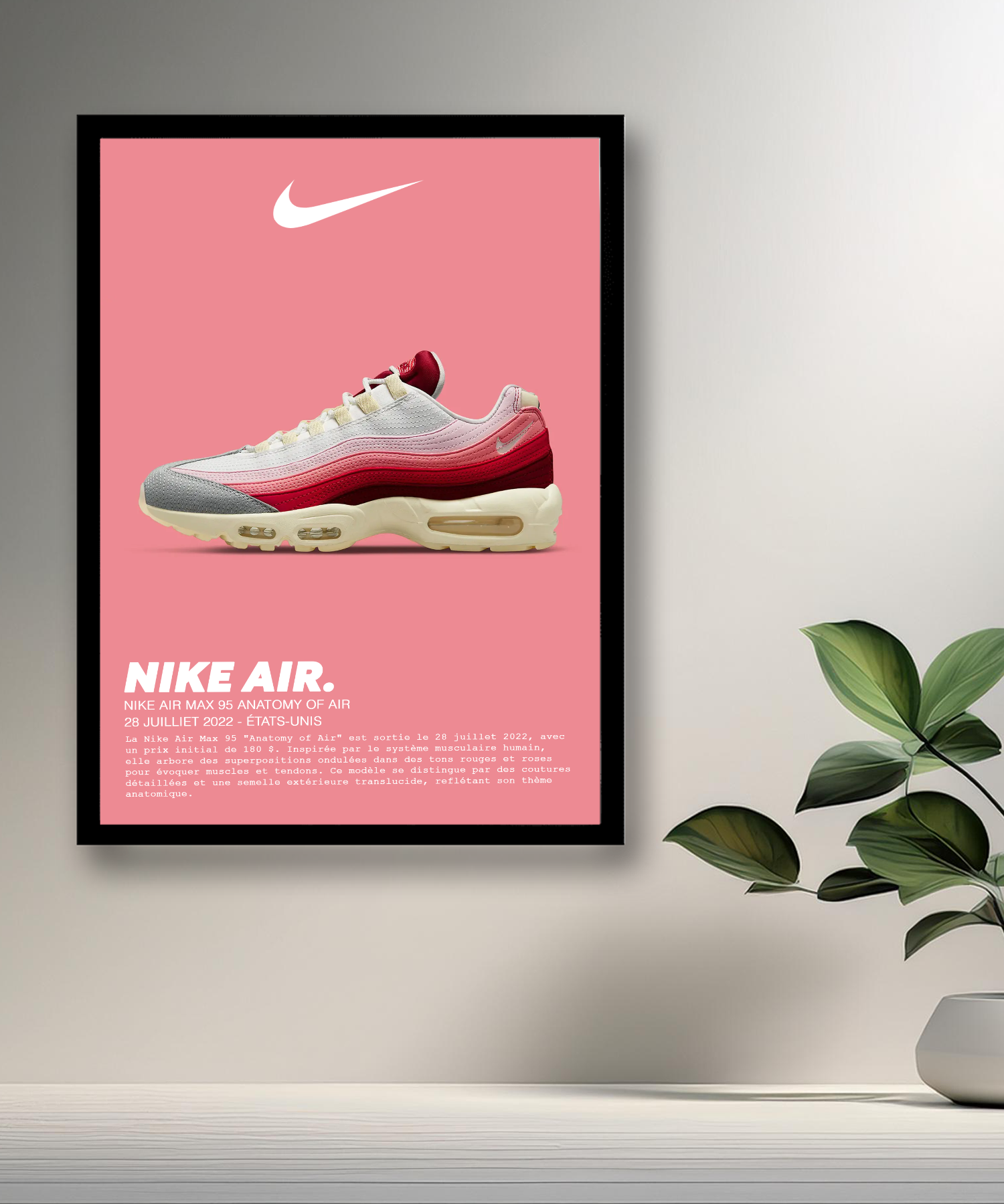 Verleihen Sie Ihrer Dekoration einen Hauch von Stil und Finesse mit diesem Fotorahmen, der den Nike Air Max 95 „Anatomy of Air“ in seiner rosa Version hervorhebt. Inspiriert von der anatomischen Struktur des menschlichen Körpers, zeichnet sich dieser Sneaker durch seine weichen und dezenten Rosatöne aus, die mit einem eleganten und innovativen Design an die Muskelschichten erinnern.