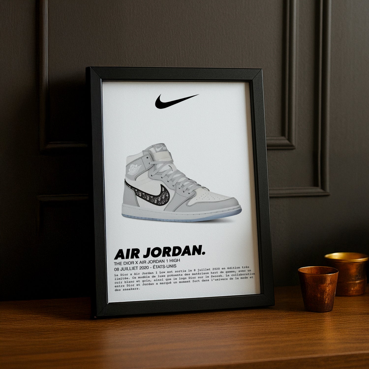 Dieser Bilderrahmen ist in verschiedenen Formaten erhältlich und eignet sich perfekt für die Dekoration eines Moderaums, eines Büros oder eines Wohnzimmers. Verleihen Sie Ihrem Interieur mit diesem Air Jordan 1 High x Dior einen Hauch von Eleganz und Prestige und zeigen Sie Ihre Leidenschaft für eine der großartigsten Partnerschaften zwischen Streetwear und Haute Couture.