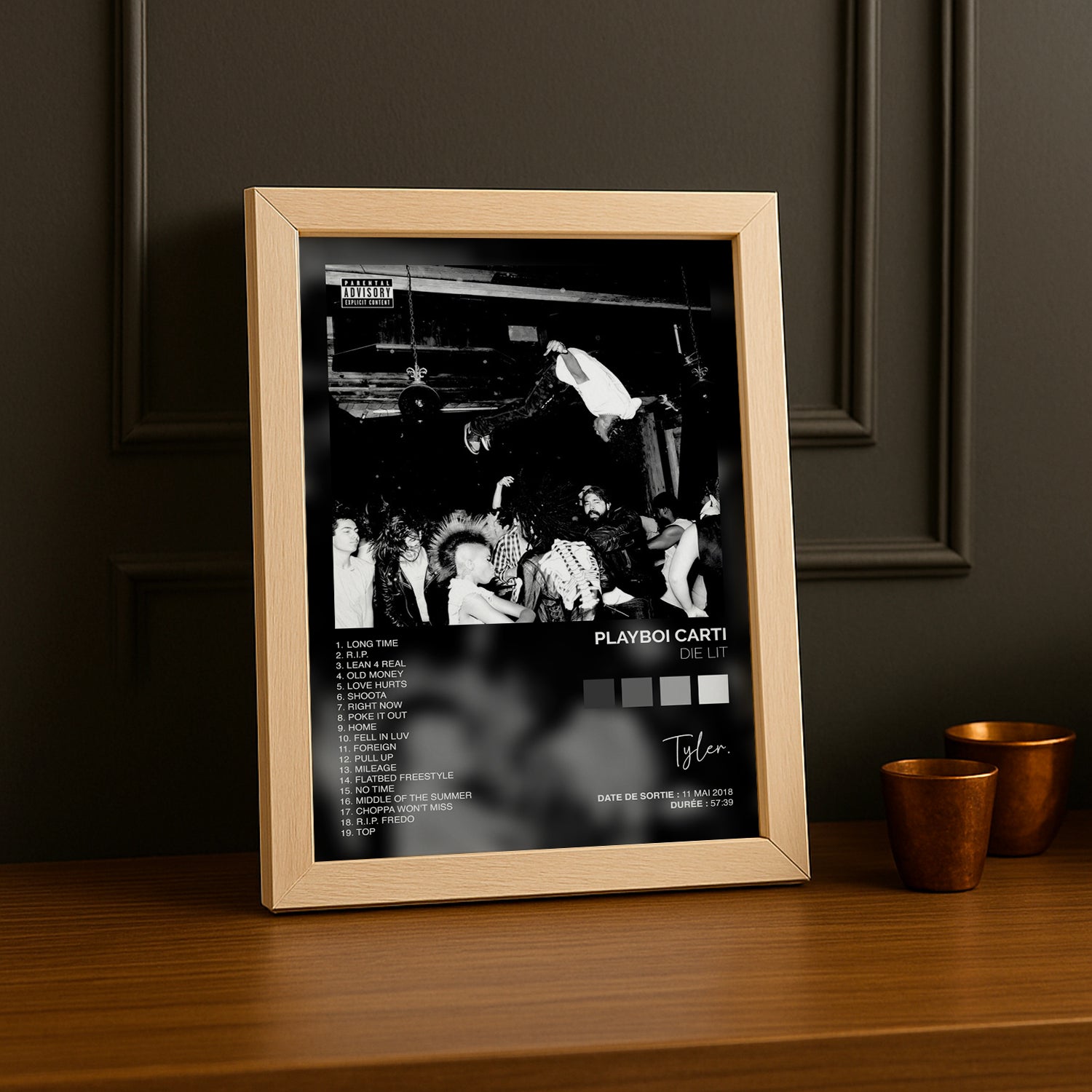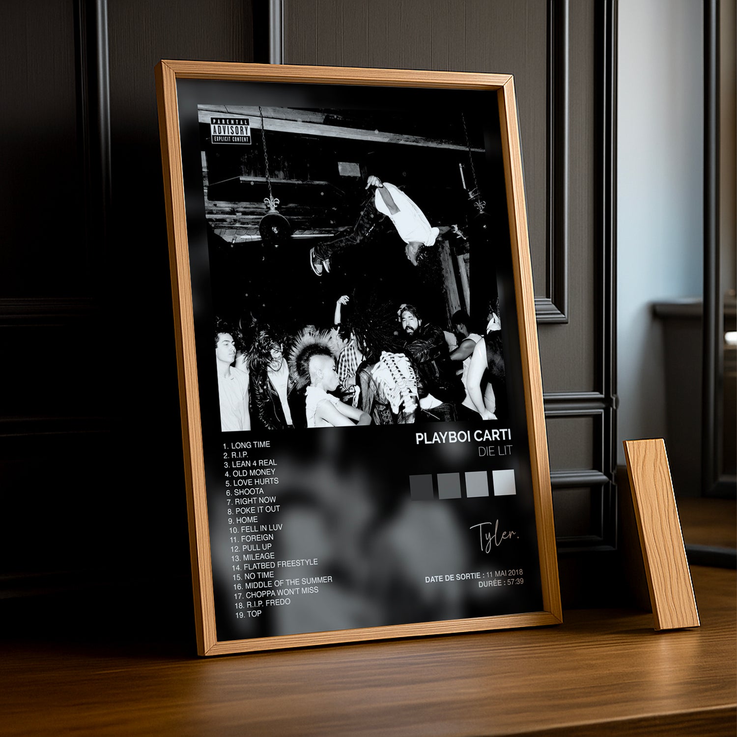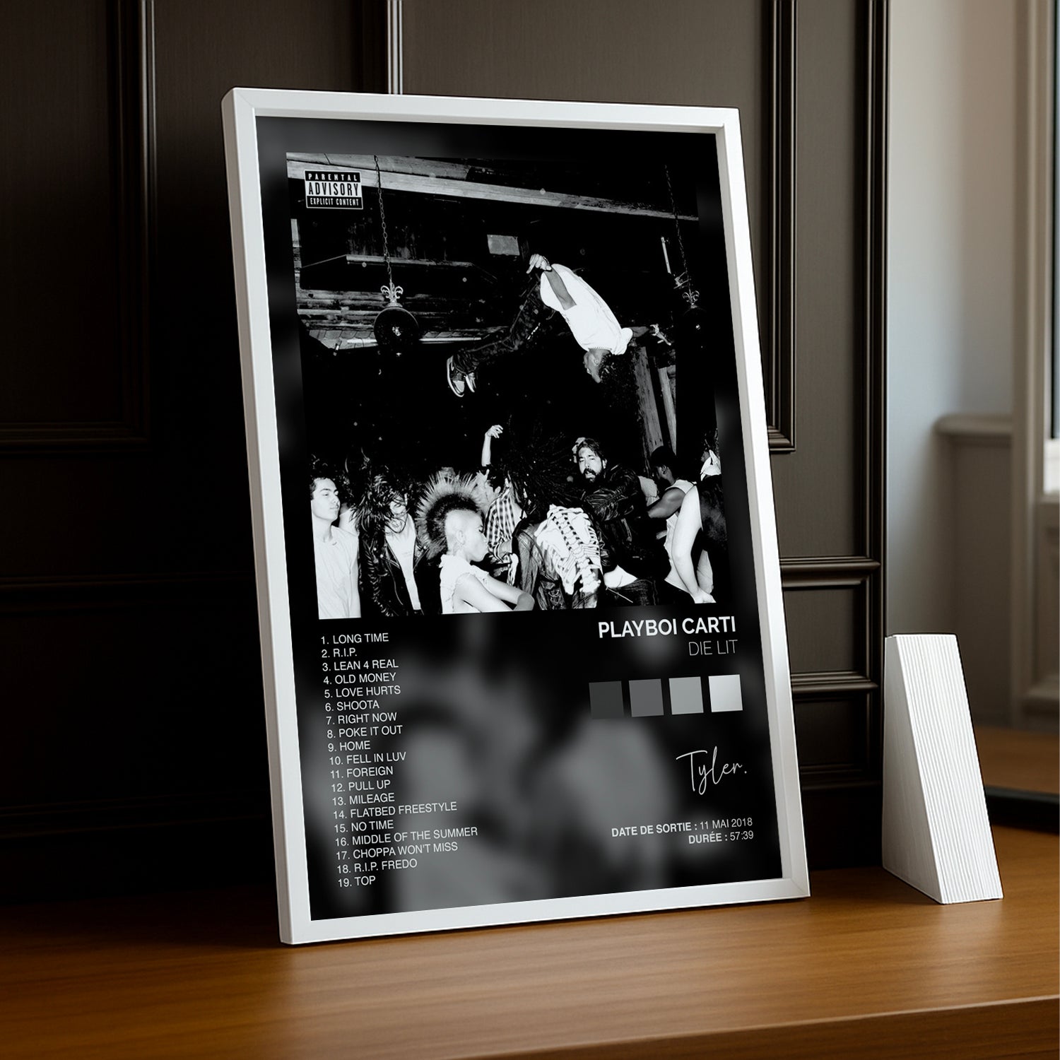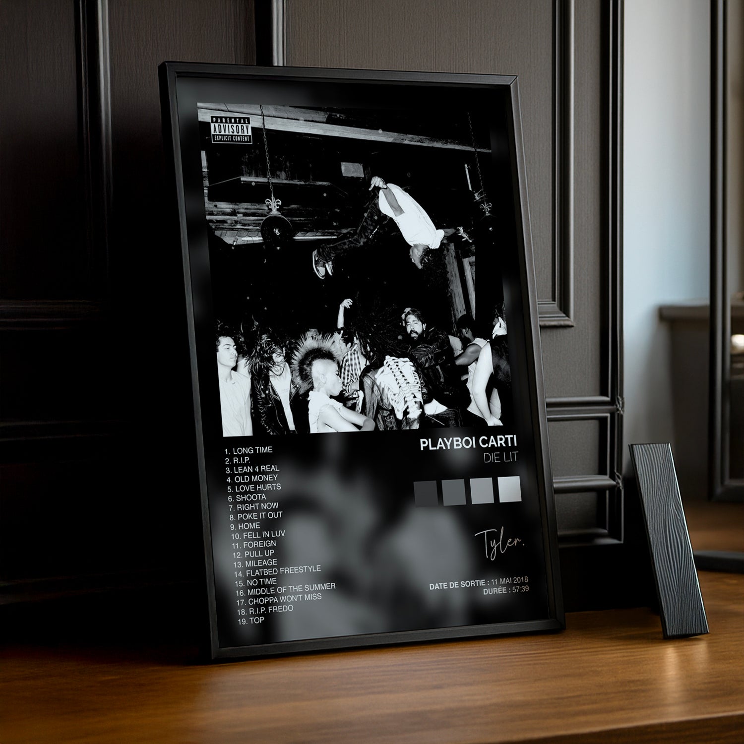 Affiche ton style avec ce poster exclusif de l’album "Die Lit" de Playboi Carti. Représentant l’esthétique audacieuse et avant-gardiste du rappeur, ce visuel est parfait pour une déco urbaine moderne et énergique.
