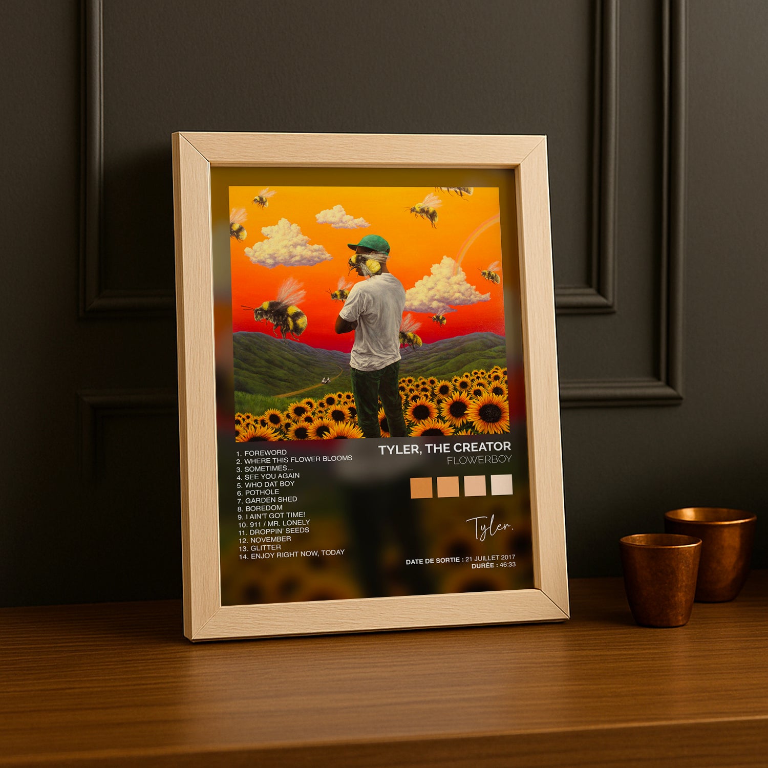 Ajoute une touche artistique et colorée à ta décoration avec ce poster exclusif de l’album "Flowerboy" de Tyler, The Creator. Ce visuel vibrant reflète l’univers unique et introspectif de l’artiste, un incontournable pour tous les fans de rap alternatif et créatif.