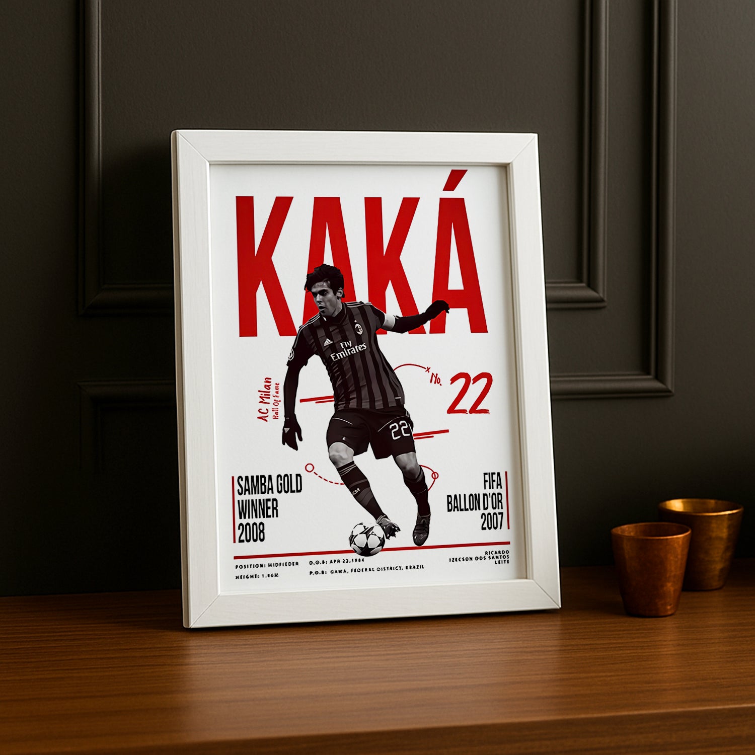Un Chef-d'Œuvre Pour les Fans de Football et de Légendes Inoubliables Affichez votre admiration pour Kaká, l'un des joueurs les plus talentueux et charismatiques du football mondial, avec ce cadre photo exceptionnel ! Imprimé en haute définition, chaque détail capture sa technique raffinée, sa vision du jeu et son incroyable palmarès, notamment sa victoire au Ballon d'Or 2007 et ses exploits avec AC Milan et le Real Madrid. Parfait pour ajouter une touche d'élégance et de magie à votre salon, bureau ou espace de jeu.