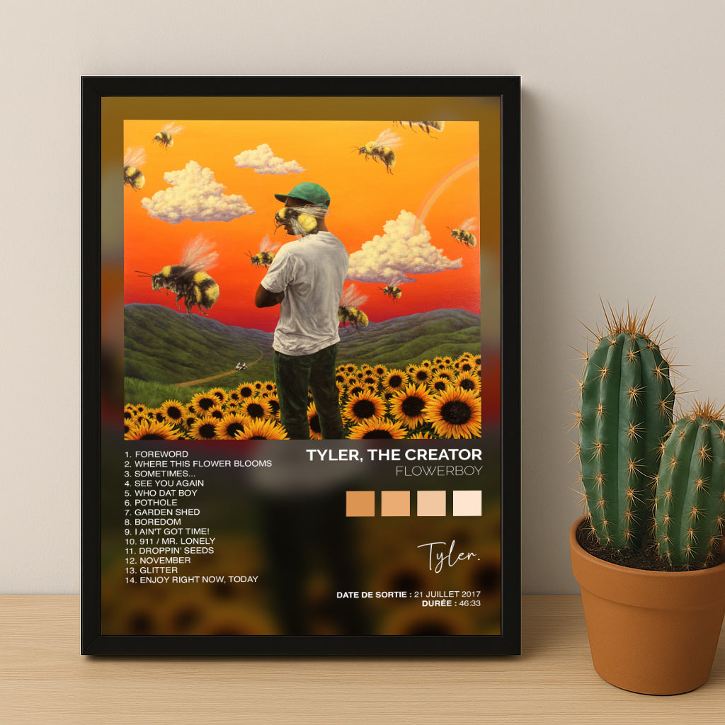 Ajoute une touche artistique et colorée à ta décoration avec ce poster exclusif de l’album "Flowerboy" de Tyler, The Creator. Ce visuel vibrant reflète l’univers unique et introspectif de l’artiste, un incontournable pour tous les fans de rap alternatif et créatif.