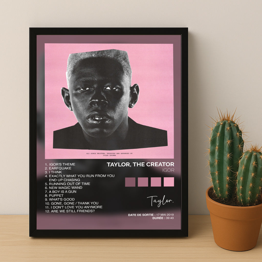Apporte une touche artistique et audacieuse à ta déco avec ce poster exclusif de l’album "Igor" de Tyler, The Creator. Ce visuel coloré et unique capture l’essence créative et avant-gardiste d’un des albums les plus innovants du hip-hop moderne.