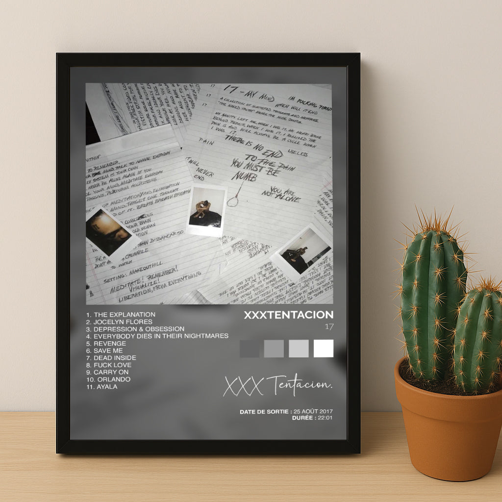 Célèbre l’impact poignant de Tentacion avec ce poster exclusif de l’album "17". Ce visuel sobre et intense reflète l’émotion brute et la profondeur de cet album incontournable du rap alternatif.